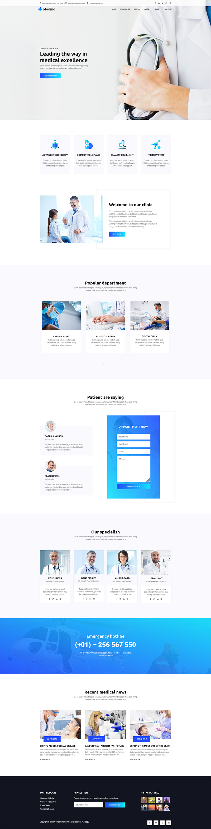 这款蓝白简约的医疗检测机构html模板,设计风格简洁大方,采用了蓝白色调,整体感觉简洁自然。同时,页面中添加了大量的图片和文字,以便更好地展示医疗检测的成果和专业。加载速度快,功能完善。适合医院医疗检测机构等行业网站html模板。
