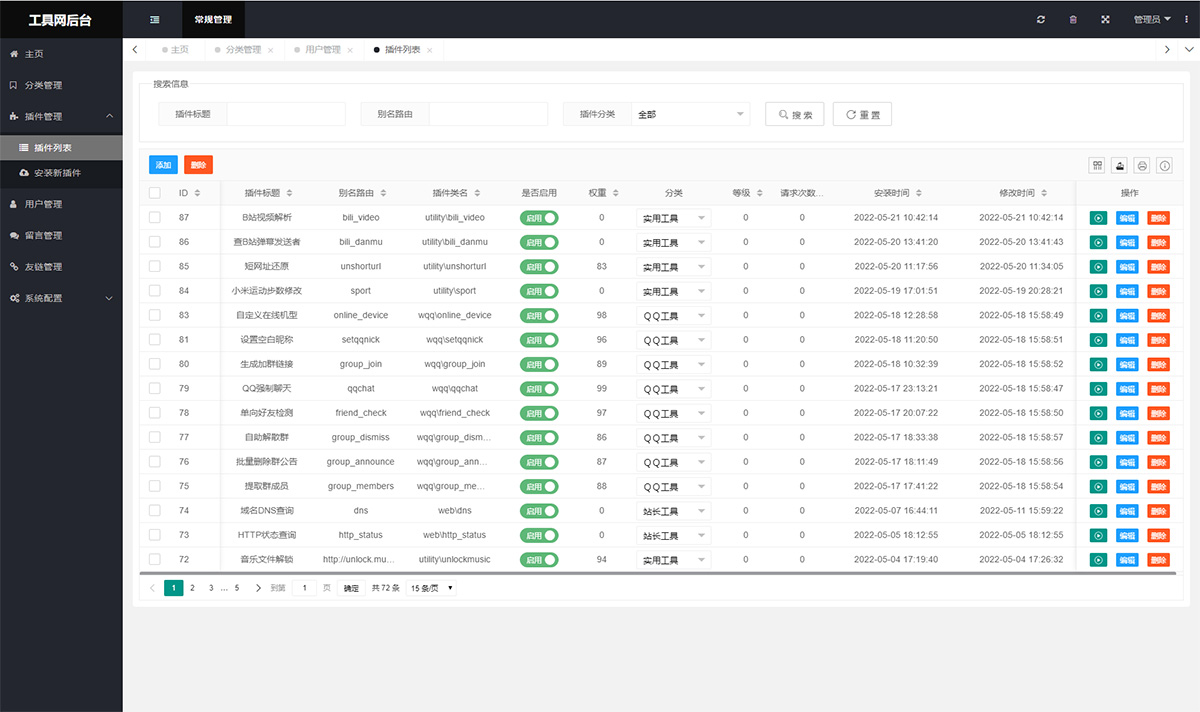 70多种在线工具,包括站长工具、开发工具、生活工具等。本地调用API、自带免费API接口,是一个多功能性在线工具箱网站源码,支持后台管理、上传插件、添加增减删功能。